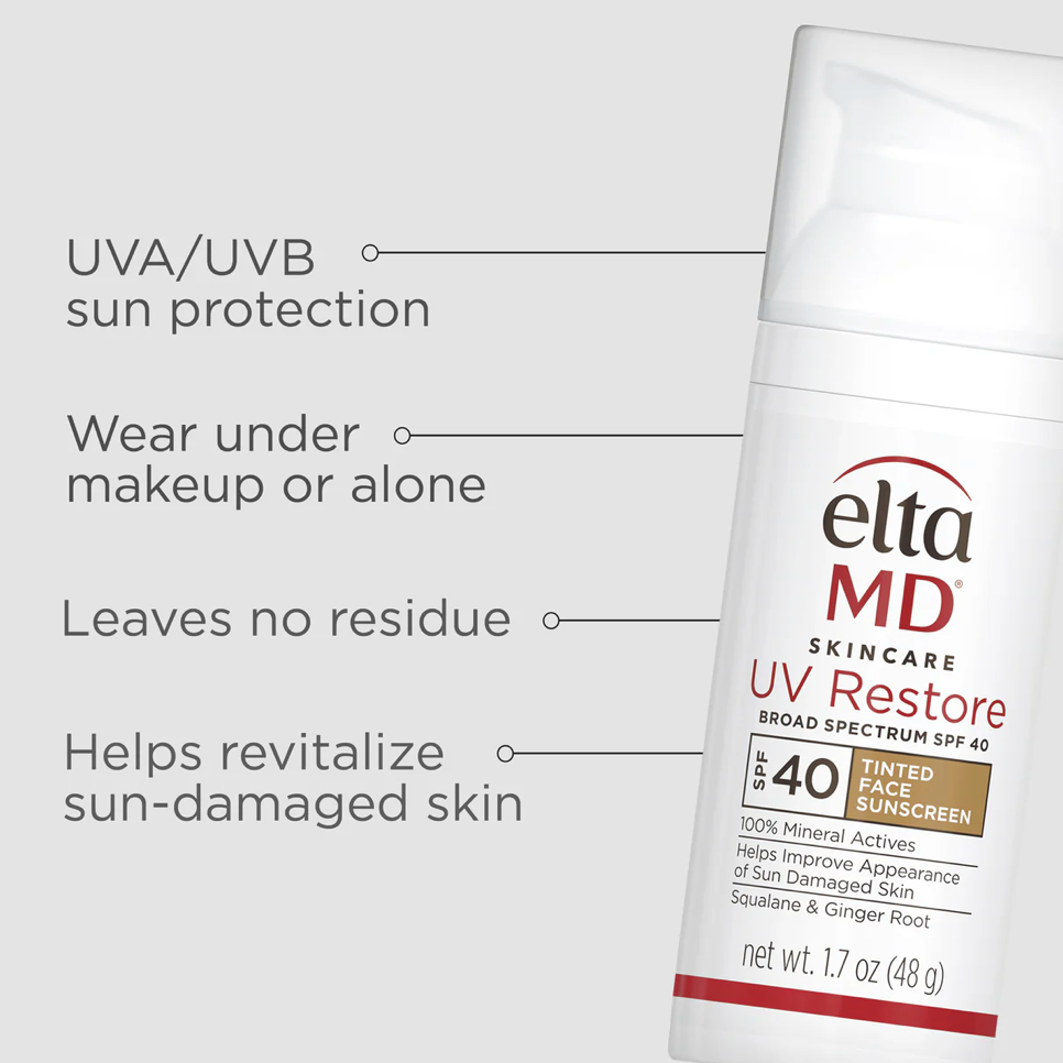eltaMD UV Restore Broad-Spectrum SPF 40 is a 100% mineral sunscreen that improves sun-damaged skin and helps revitalize it. This advanced formula contains Squalane which restores skin's natural moisture and suppleness.